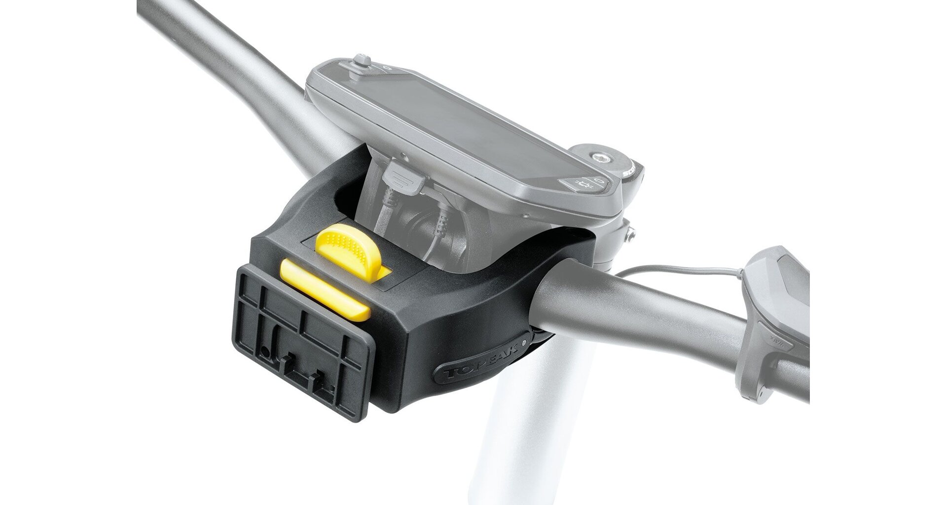 E-Bike Ready design: Prodloužená ramena držáku zajišťují dostatečný odstup brašny od řídítek, čímž vzniká prostor pro většinu středových displejů (např. Bosch, Shimano Steps a další).