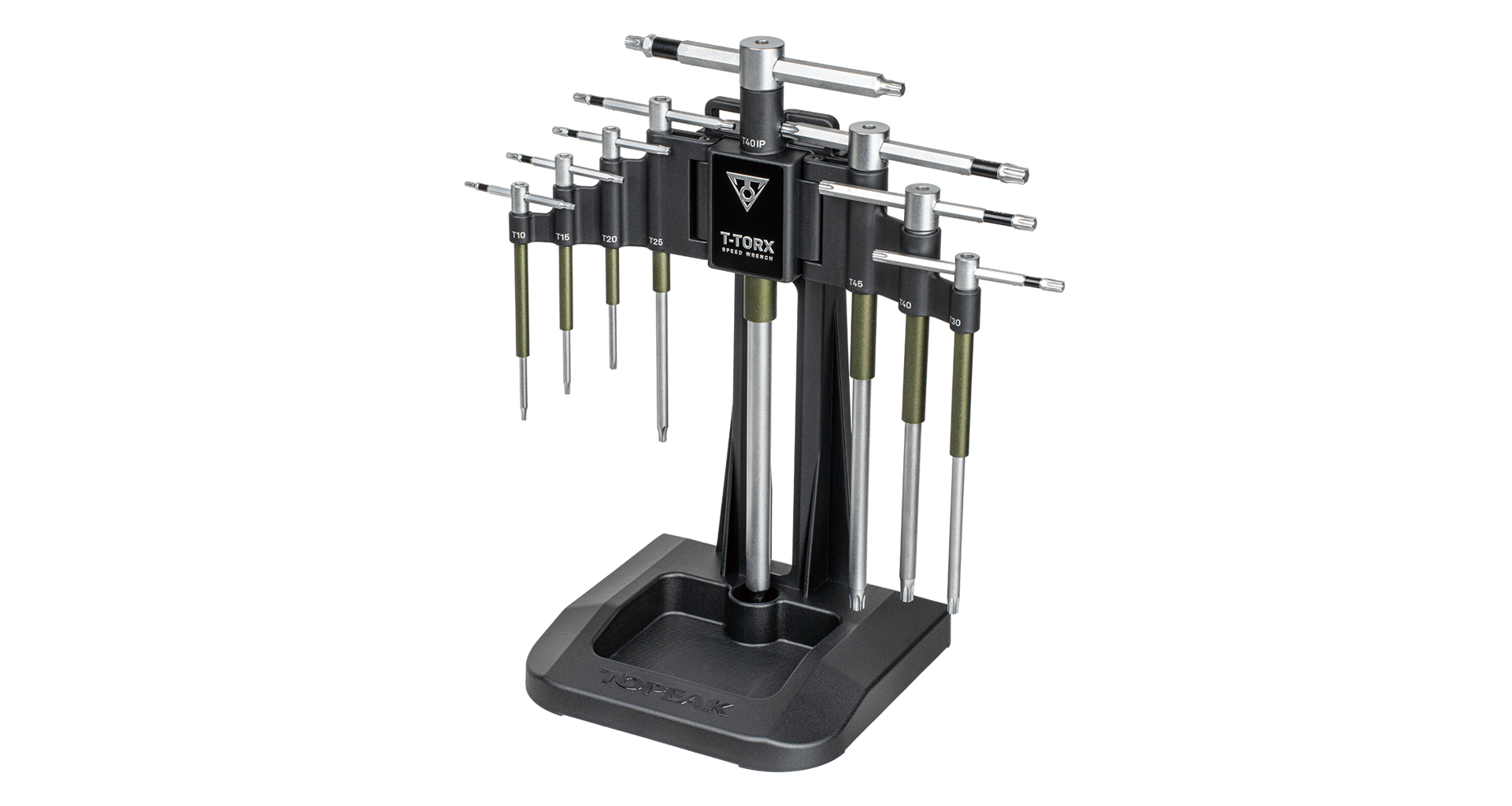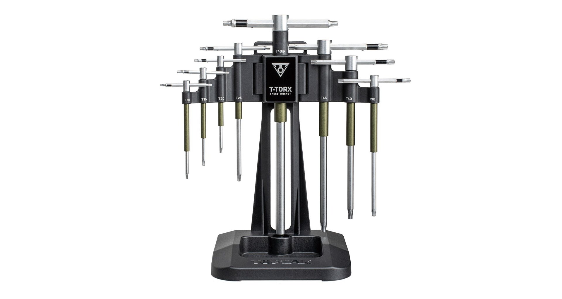 Nekompromisní Torx arzenál pro precizní mechaniky. S nástupem moderních komponentů roste potřeba kvalitního Torx nářadí a Topeak T-Torx Speed Wrench Set je odpovědí na tyto požadavky. Tato sada pokrývá vše od jemného T10 až po robustní T45, přičemž obsahuje i specifický rozměr T40 IP pro nejnovější standardy. Revoluční prvek Speed Sleeve umožňuje klíči volně rotovat v dlani, čímž eliminuje zdlouhavé přehmatávání při šroubování dlouhých závitů. Posuvná rukojeť nabízí variabilitu – v poloze „T“ získáte maximální stabilitu, zatímco posunutím do polohy „L“ vytvoříte obrovskou páku pro nejtěžší úkony. Celý set je vyroben z prémiových kalených ocelí a uložen v robustním stojanu, který lze volitelně připevnit na stěnu či servisní stojan.