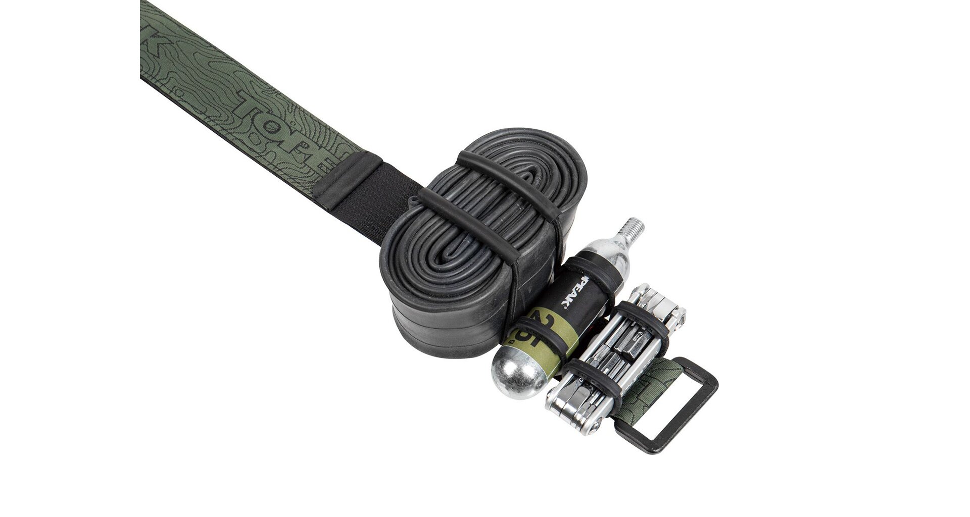 Systém vnitřních popruhů: Dva nylonové pásky drží nářadí a duši pohromadě i po sejmutí z kola.