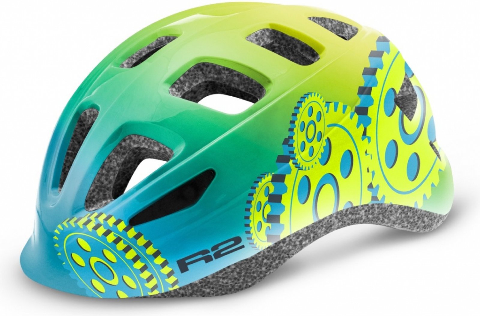 Přilba R2 Bunny – Lesklá modrá/Neonová žlutá/Ozubené kolečko Vel. XS 48-50 cm