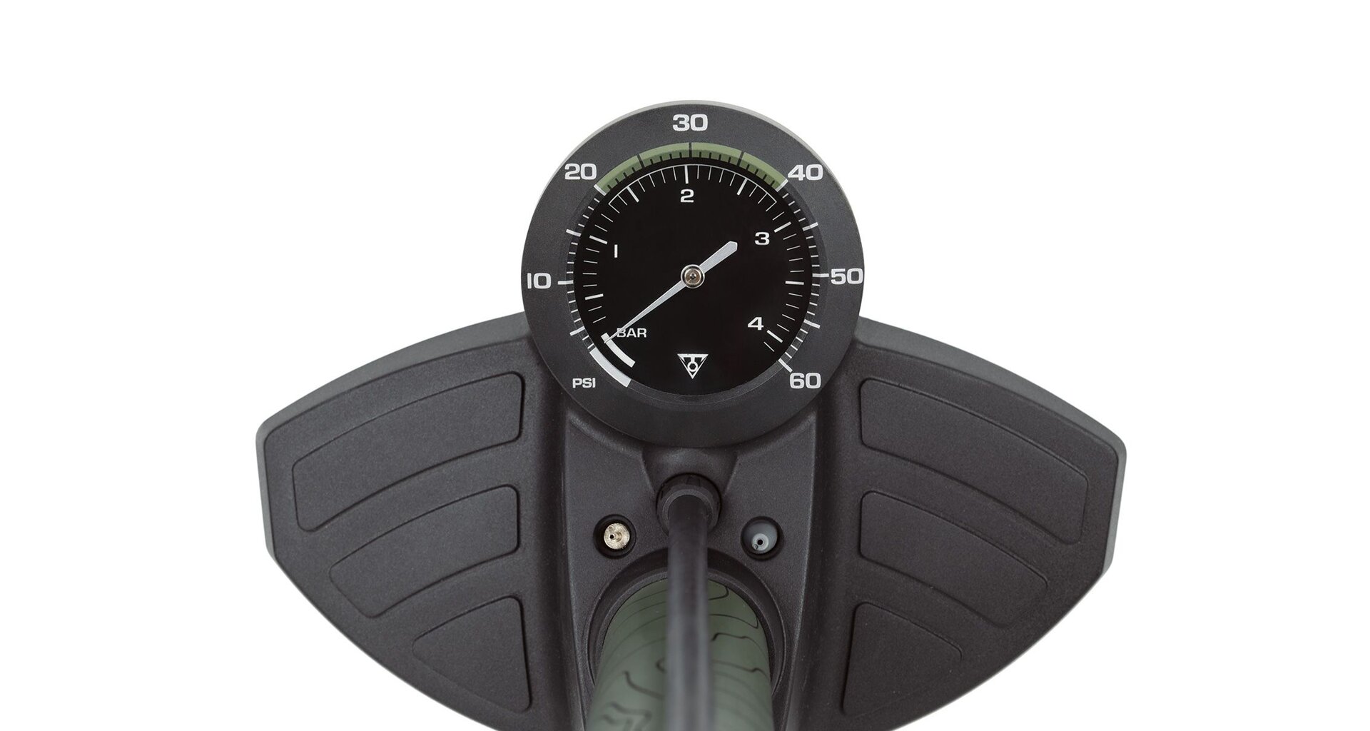 Klíčovým prvkem pro terénní jezdce je velký 3,5 palcový manometr umístěný v základně. Má jemnou stupnici s rozsahem do 4 barů (60 psi), což umožňuje číst i ty nejmenší změny tlaku, které jsou pro trakci v terénu zásadní. Pumpa je osazena osvědčenou oboustrannou hlavicí TwinHead, která si poradí se všemi typy ventilků (galuskový, auto, Dunlop). Přímo na hlavici navíc najdete upouštěcí tlačítko, díky kterému můžete tlak jemně korigovat bez nutnosti odpojování pumpy. Extra dlouhá hadice a ergonomická rukojeť jen podtrhují celkový komfort tohoto objemového krále.