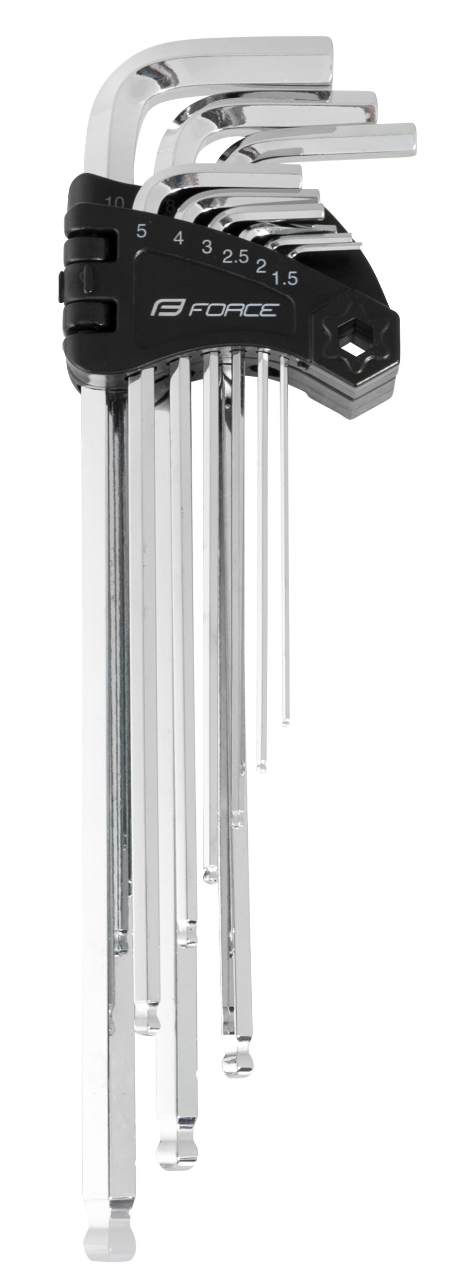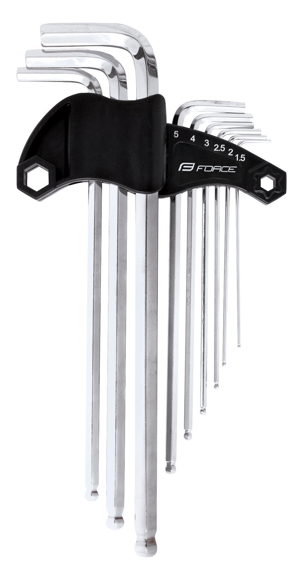 sada 9 ks TVRZENÝCH inbusů:1,5/ 2/ 2,5/ 3/ 4/ 5/ 6/ 8/ 10 mms kuličkou na konci, v plastovém držákumateriál: Fe nástrojová ocel Cr-V, chromovanáhmotnost: 430 gbaleno v blistru FORCEurčeno k PROFI použití