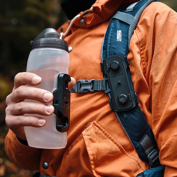 Konektor se snadno připevní na svislé popruhy batohu pomocí gumového kroužku.