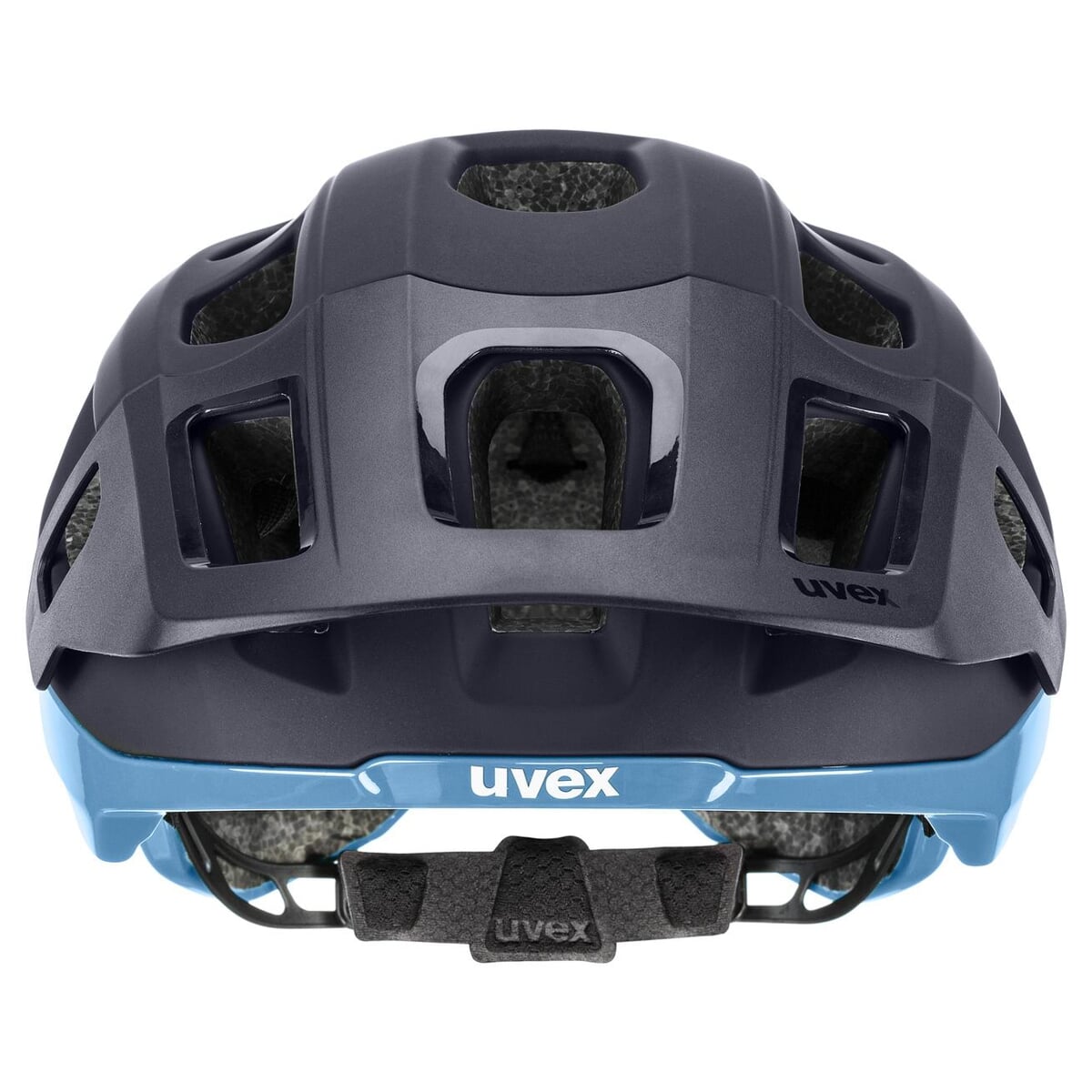 Helma Uvex React Deep Space Azure Matt je navržena tak, aby dobře obepínala hlavu a poskytovala stabilní pocit i při svižnější jízdě nebo průjezdu nerovným terénem.